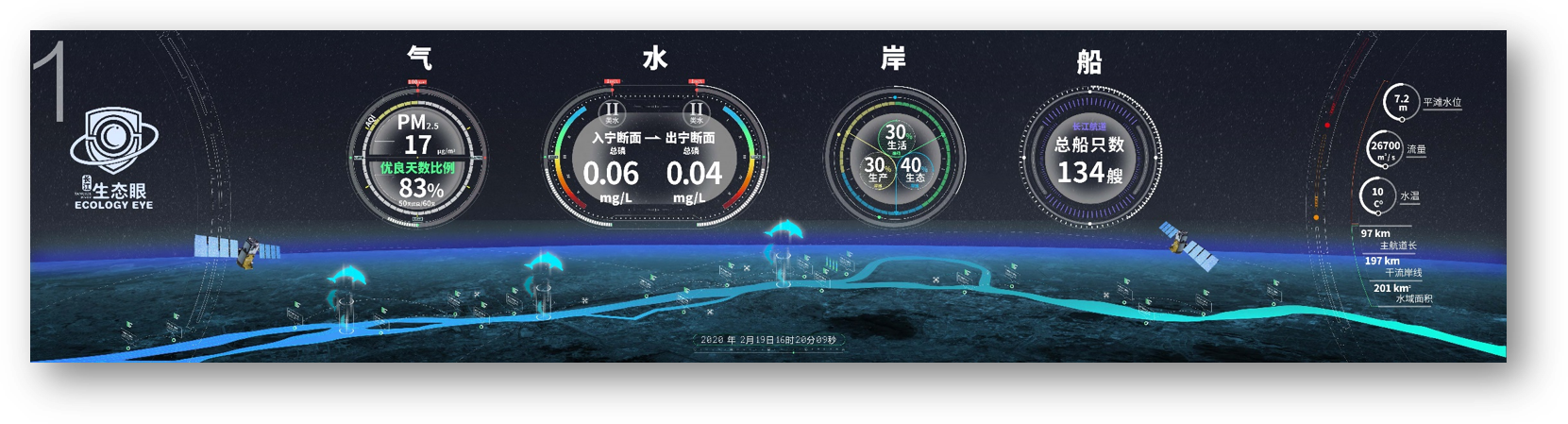 項目以長江沿線某緩沖區3公里區域為重點,設計“水陸空”于一體的智慧管控與決策輔助體系,通過數據分析和人工智能等手段,實現生態眼感知數據增值,助力長江綠色生態帶、轉型發展帶、人文景觀帶、嚴管示范帶建設,推動長江沿線高水平發展,為打造“新時代城市樣板”提供決策參考。